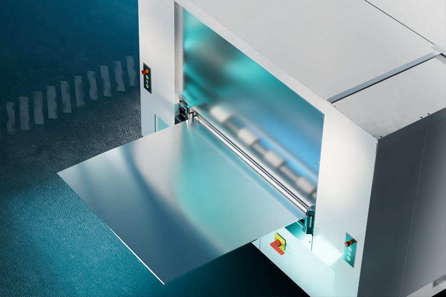 Maszyna pobiera blachę bezpośrednio z kręgu i automatycznie ją prostuje. Różne folie ochronne mogą być nakładane bezpośrednio przy wejściu blachy do maszyny, co zapewnia ochronę materiału podczas obróbki.